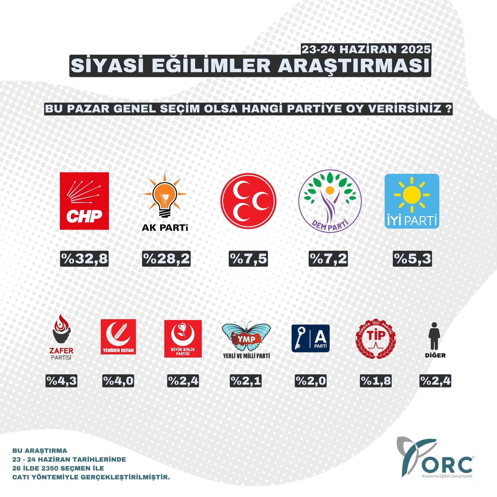 ORC Araştırma, 26 vilayette yaptığı genel seçim anketinin bulgularını kamuoyu ile paylaştı. Ankette CHP’nin birinci parti olduğu görüldü.