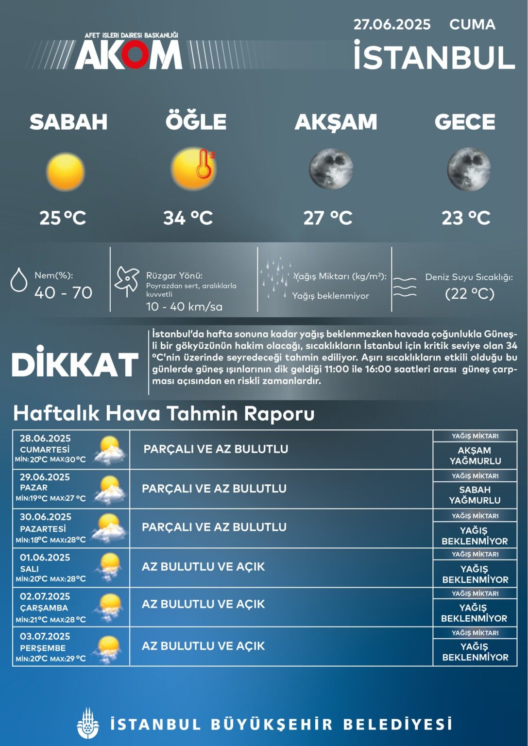 Adil Tek, İstanbul’da ölçülen sıcaklıkların gölgede 35 derece düzeyinde olduğunu, lakin güneş altında hissedilen sıcaklığın 39 dereceyi bulabileceğini belirtti. Yüksek nem oranına da dikkat çeken Tek, “Nem yükseldiğinde beden gereğince terleyemiyor, bu da havanın daha bunaltıcı hissedilmesine yol açıyor” tabirlerini kullandı.